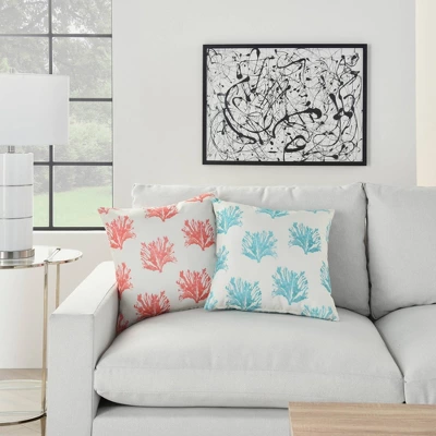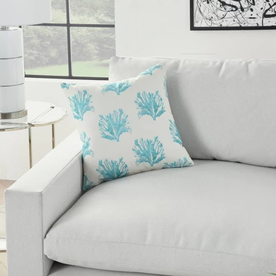 Add coastal charm to your patio furniture with this reversible indoor/outdoor throw pillow from Mina Victory Home Accents. A repeat pattern of coral adorns its face in this artistic interpretation of underwater life. Handmade of polyester in turquoise blue and ivory, it reverses to a vibrantly scalloped drop pattern for double the design power. 18” square includes a poly-fill insert and zipper closure.